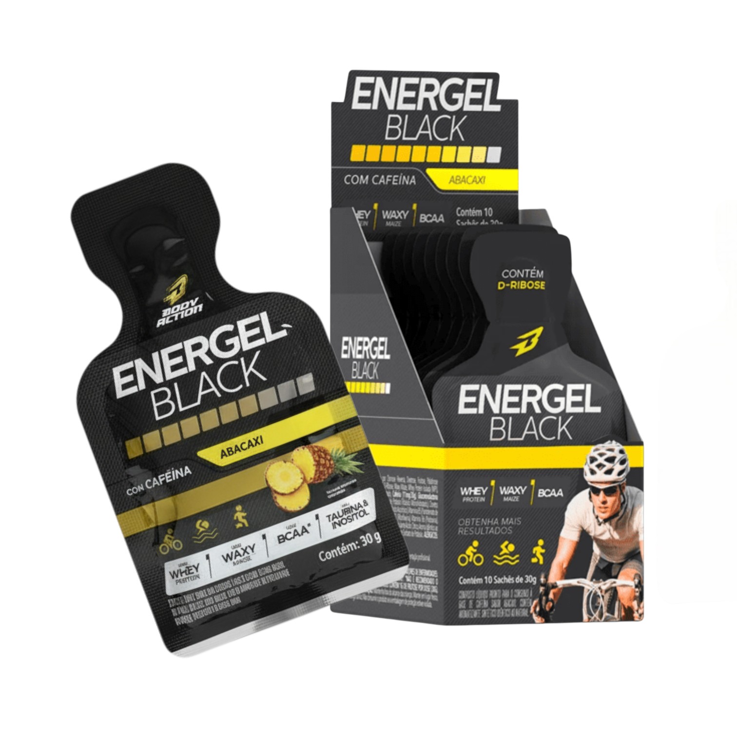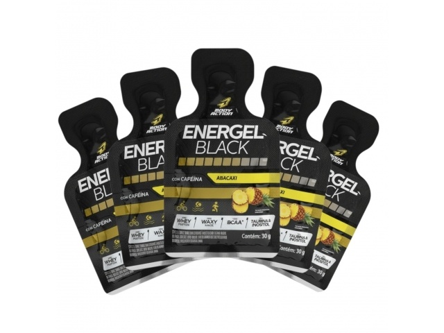 Pack de 5 geles Energel Black sabor uva con cafeína, diseñados para potenciar tu energía en ciclismo, running y entrenamientos intensos.