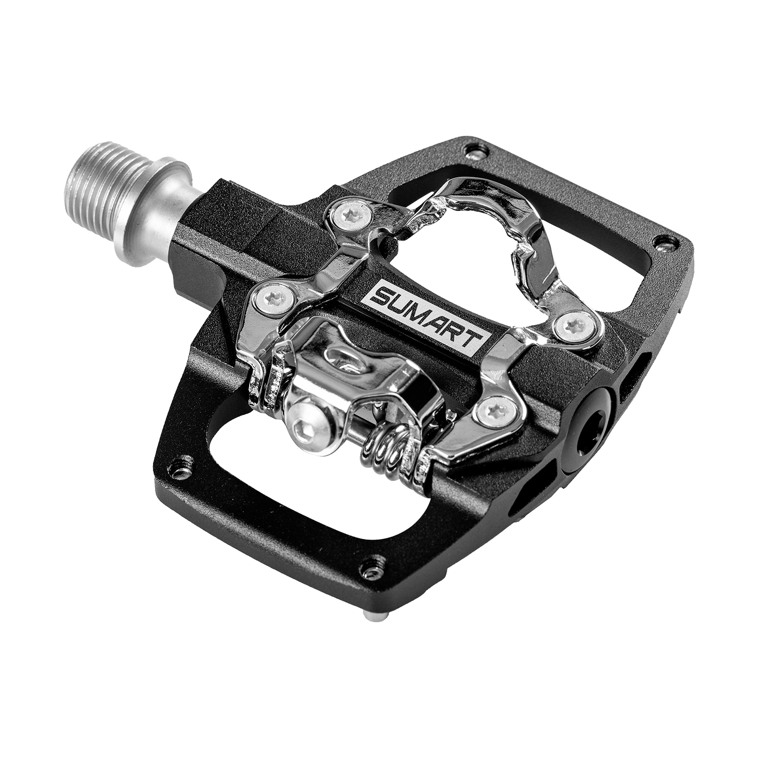 Los pedales SUMART PD-2DP combinan lo mejor de ambos mundos: un lado con mecanismo SPD para una conexión eficiente con calas y otro con plataforma plana con pasadores para mayor agarre al usar calzado normal. Su diseño en aluminio mecanizado CNC y eje en Cr-Mo garantizan resistencia y durabilidad, incluso en condiciones exigentes.