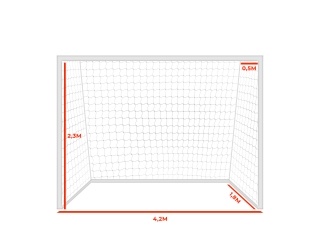 - Dimensiones: 4,20 m de ancho, 2,30 m de altura, 0,50 m de retroceso superior y 1,80 m de retroceso inferior, asegurando un ajuste perfecto para las porterías de Baby Fútbol.